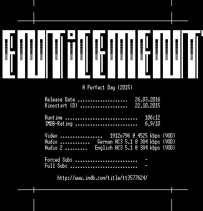 | FiLENAME: | A.Perfect.Day.German.DL.AC3.1080p.WebHD.h264-ENTiCEMENT.mkv |