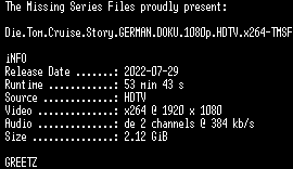| FiLENAME: | Die.Tom.Cruise.Story.GERMAN.DOKU.1080p.HDTV.x264-TMSF.mkv |