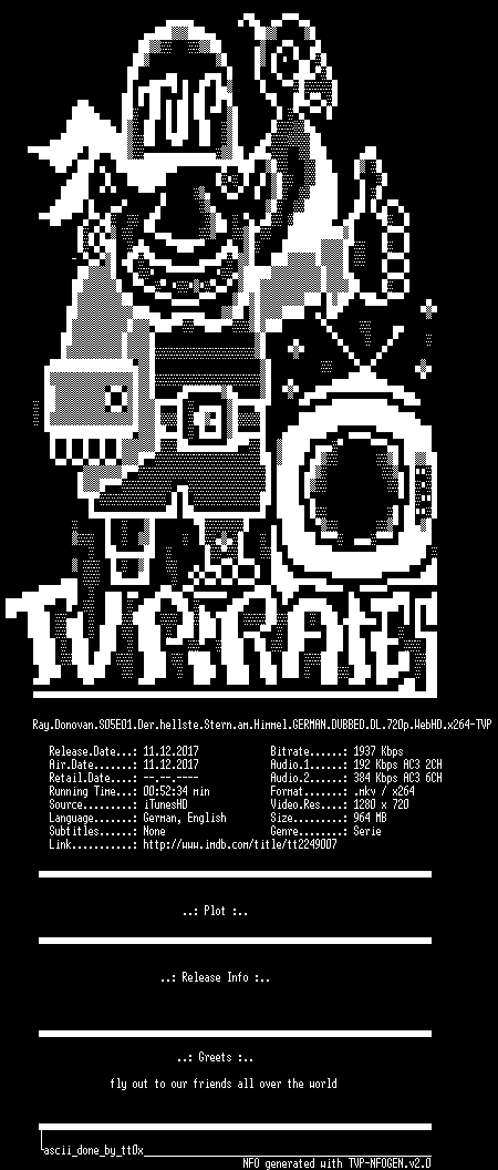 | FiLENAME: | Ray.Donovan.S05E01.Der.hellste.Stern.am.Himmel.GERMAN.DUBBED.DL.720p.WebHD.x264-TVP.mkv |