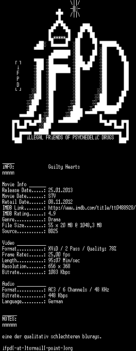 | FiLENAME: | Guilty.Hearts.2006.German.AC3.BDRiP.XViD-iFPD.avi |