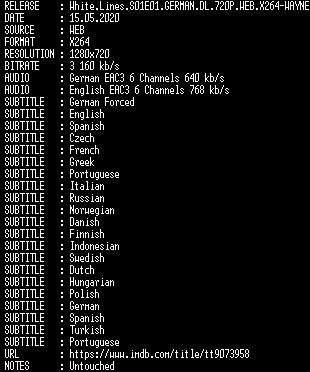 | FiLENAME: | White.Lines.S01E01.GERMAN.DL.720P.WEB.X264-WAYNE.mkv |