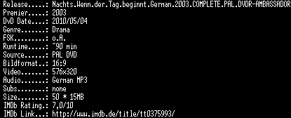 | FiLENAME: | Nachts.Wenn.der.Tag.beginnt.German.2003.DVDRiP.XViD-AMBASSADOR.avi |