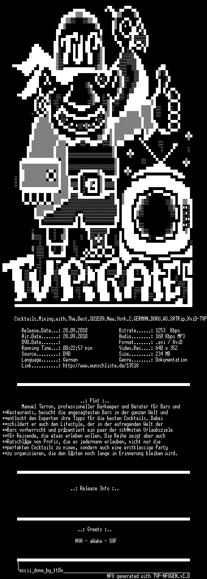 | FiLENAME: | Cocktails.Mixing.with.The.Best.S01E09.New.York.2.GERMAN.DOKU.WS.SATRip.XviD-TVP.avi |