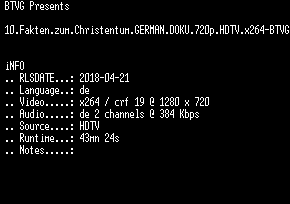 | FiLENAME: | 10.Fakten.zum.Christentum.GERMAN.DOKU.720p.HDTV.x264-BTVG.mkv |
