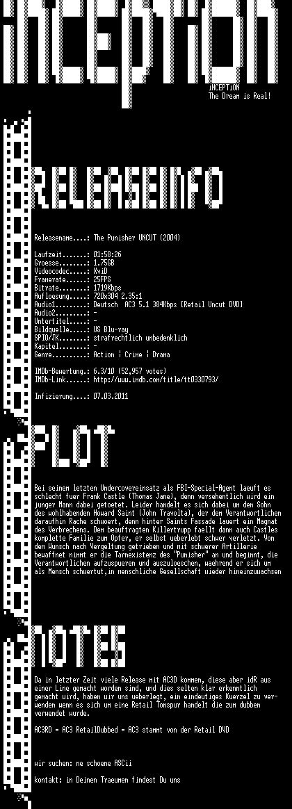 | FiLENAME: | The.Punisher.UNCUT.2004.German.AC3RD.BDRip.XviD-iNCEPTiON.avi |