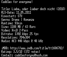 | FiLENAME: | Liebe.oder.lieber.doch.nicht.German.2010.AC3.DVDRip.XviD-CUDDLES.avi |