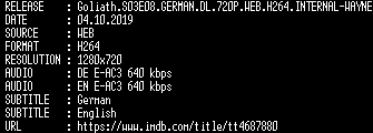 | FiLENAME: | Goliath.S03E08.GERMAN.DL.720P.WEB.H264.INTERNAL-WAYNE.mkv |