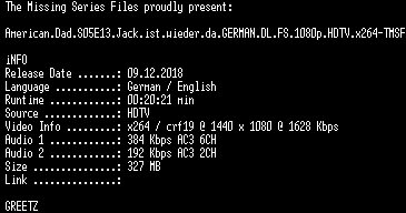 | FiLENAME: | American.Dad.S05E13.Jack.ist.wieder.da.GERMAN.DL.FS.1080p.HDTV.x264-TMSF.mkv |