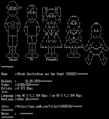 | FiLENAME: | Shrek.Geschichten.aus.dem.Sumpf.S01E02.German.DL.720p.WEBHD.x264-JuniorTV.mkv |