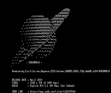 | FiLENAME: | Homecoming.Ein.Film.von.Beyonce.2019.German.SUBBED.DOKU.720p.WebHD.x264-DOKUMANiA.mkv |