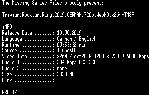 | FiLENAME: | Trivium.Rock.am.Ring.2019.GERMAN.720p.WebHD.x264-TMSF.mkv |