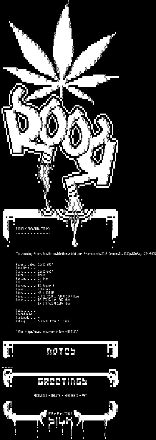 | FiLENAME: | The.Morning.After.Sex.Dates.bleiben.nicht.zum.Fruehstueck.2015.German.DL.1080p.BluRay.x264-ROOR.mkv |