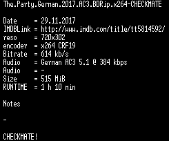 | FiLENAME: | The.Party.German.2017.AC3.BDRip.x264-CHECKMATE.mkv |