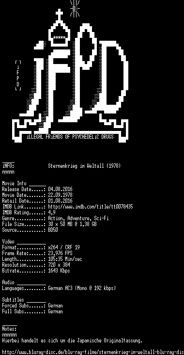 | FiLENAME: | Sternenkrieg.im.Weltall.Langfassung.German.1978.AC3.BDRiP.x264-iFPD.mkv |