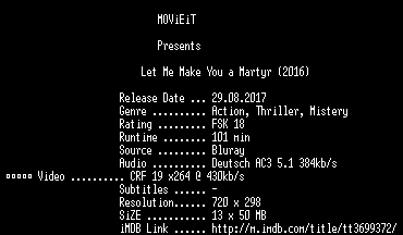 | FiLENAME: | Let.Me.Make.You.a.Martyr.2016.German.AC3.BDRip.x264-MOViEiT.mkv |