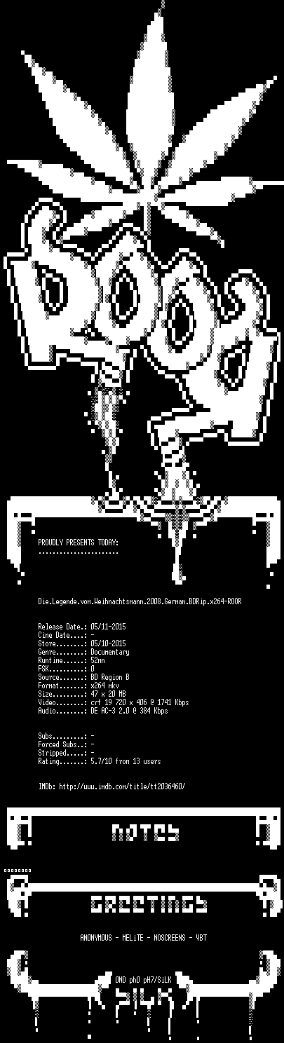 | FiLENAME: | Die.Legende.vom.Weihnachtsmann.2008.German.BDRip.x264-ROOR.mkv |