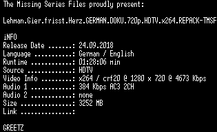 | FiLENAME: | Lehman.Gier.frisst.Herz.GERMAN.DOKU.720p.HDTV.x264.REPACK-TMSF.mkv |
