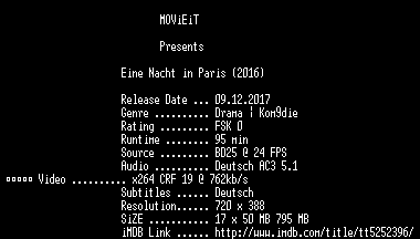 | FiLENAME: | Eine.Nacht.in.Paris.2016.German.BDRiP.x264-MOViEiT.mkv |