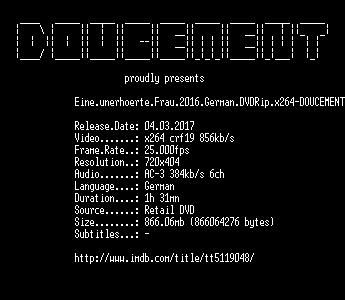 | FiLENAME: | Eine.unerhoerte.Frau.2016.German.DVDRip.x264-DOUCEMENT.mkv |