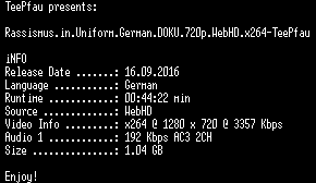 | FiLENAME: | Rassismus.in.Uniform.German.DOKU.720p.WebHD.x264-TeePfau.mkv |