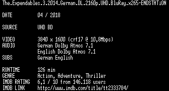 | FiLENAME: | The.Expendables.3.2014.German.DL.2160p.UHD.BluRay.x265-ENDSTATiON.mkv |