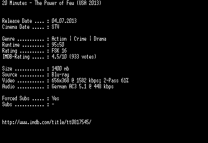 | FiLENAME: | 20.Minutes.The.Power.of.Few.German.2013.AC3.BDRiP.XViD-EXQUiSiTE.avi |