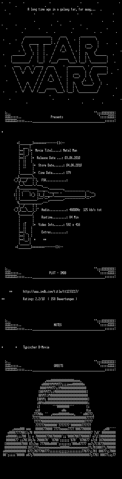 | FiLENAME: | Metal.Man.2008.German.DVDRip.XviD-StarWars.avi |