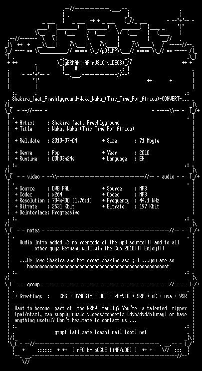 | FiLENAME: | Shakira_feat_Freshlyground-Waka_Waka_(This_Time_For_Africa)-CONVERT-x264-2010-GRMV.mkv |