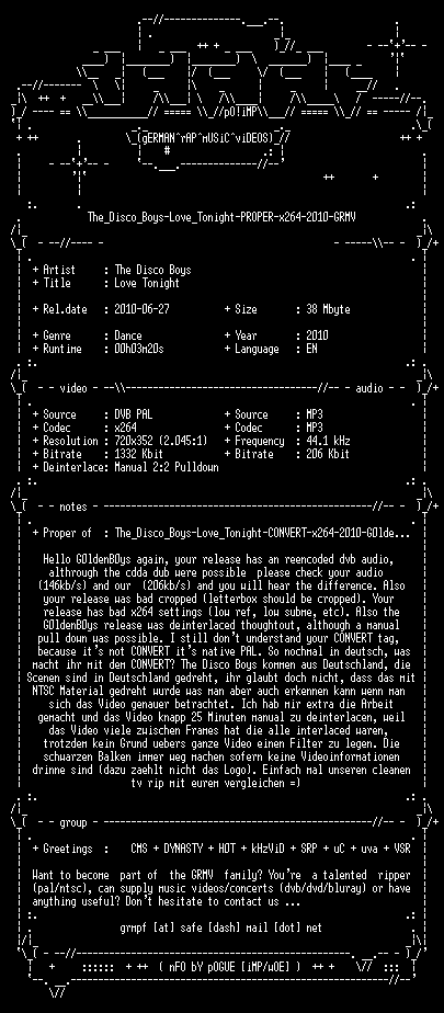 | FiLENAME: | The_Disco_Boys-Love_Tonight-PROPER-x264-2010-GRMV.mkv |