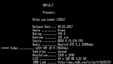 | FiLENAME: | Alles.was.kommt.2016.German.1080p.BluRay.x264-MOViEiT.mkv |