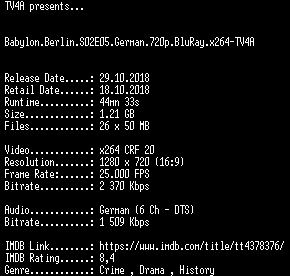 | FiLENAME: | Babylon.Berlin.S02E05.German.720p.BluRay.x264-TV4A.mkv |
