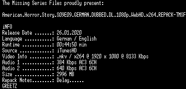 | FiLENAME: | American.Horror.Story.S09E09.GERMAN.DUBBED.DL.1080p.WebHD.x264.REPACK-TMSF.mkv |