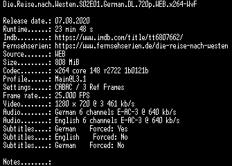 | FiLENAME: | Die.Reise.nach.Westen.S02E01.German.DL.720p.WEB.x264-WvF.mkv |