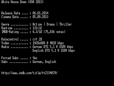 | FiLENAME: | White.House.Down.German.DL.1080p.BluRay.x264-EXQUiSiTE.mkv |