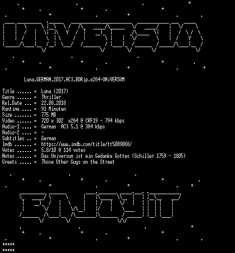 | FiLENAME: | Luna.GERMAN.2017.AC3.BDRip.x264-UNiVERSUM.mkv |