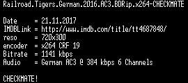 | FiLENAME: | Railroad.Tigers.German.2016.AC3.BDRip.x264-CHECKMATE.mkv |