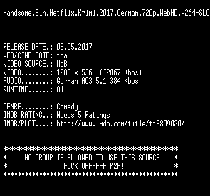 | FiLENAME: | Handsome.Ein.Netflix.Krimi.2017.German.720p.WebHD.x264-SLG.mkv |