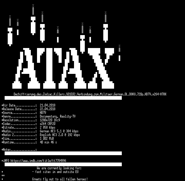 | FiLENAME: | Dechiffrierung.des.Zodiac.Killers.S01E02.Verbindung.zum.Militaer.German.DL.DOKU.720p.HDTV.x264-ATAX.mkv |