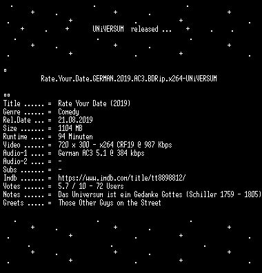 | FiLENAME: | Rate.Your.Date.GERMAN.2019.AC3.BDRip.x264-UNiVERSUM.mkv |