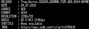 | FiLENAME: | True.Horror.S01E04.GERMAN.720P.WEB.H264-WAYNE.mkv |