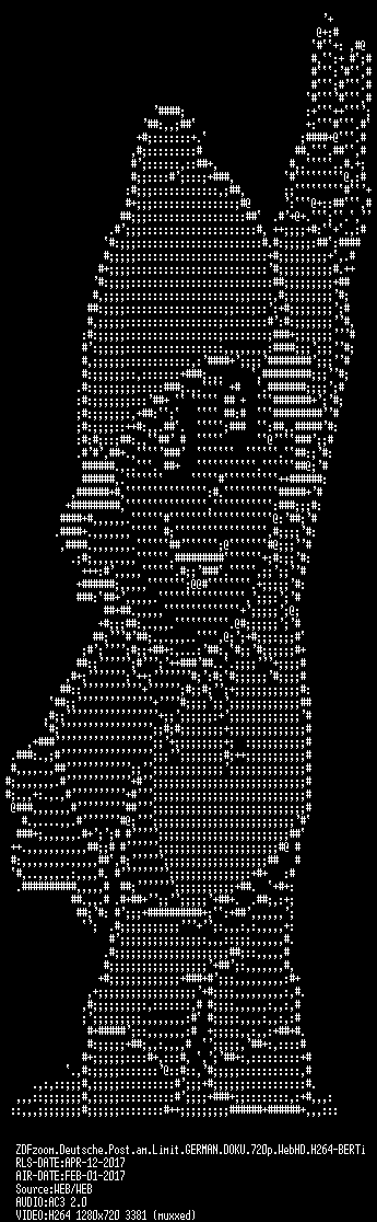 | FiLENAME: | ZDFzoom.Deutsche.Post.am.Limit.GERMAN.DOKU.720p.WebHD.H264-BERTi.mkv |