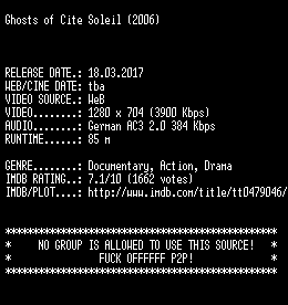 | FiLENAME: | Ghosts.of.Cite.Soleil.2006.German.720p.WebHD.x264-SLG.mkv |