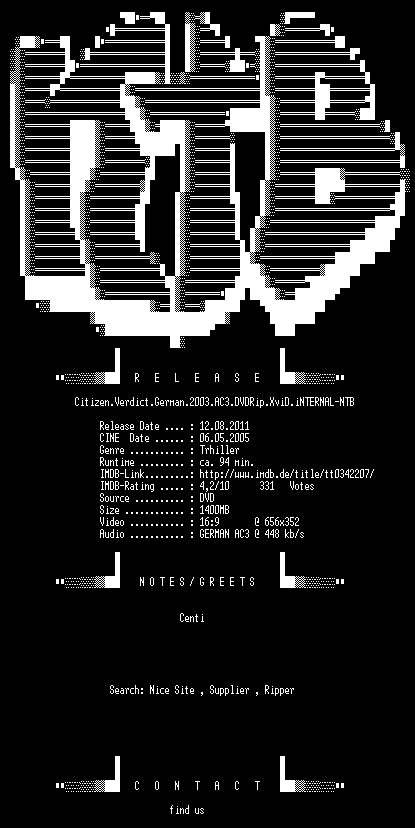| FiLENAME: | Citizen.Verdict.German.2003.AC3.DVDRip.XviD.iNTERNAL-NTB.avi |
