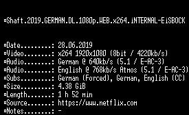 | FiLENAME: | Shaft.2019.GERMAN.DL.1080p.WEB.x264.iNTERNAL-EiSBOCK.mkv |