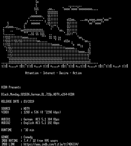 | FiLENAME: | Black.Monday.S01E06.German.DL.720p.HDTV.x264-AIDA.mkv |