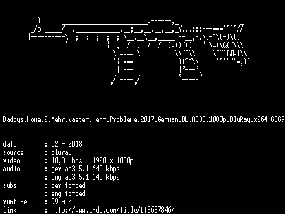 | FiLENAME: | Daddys.Home.2.Mehr.Vaeter.mehr.Probleme.2017.German.DL.AC3D.1080p.BluRay.x264-GSG9.mkv |