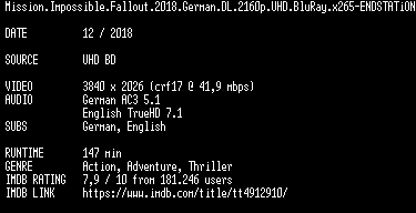 | FiLENAME: | Mission.Impossible.Fallout.2018.German.DL.2160p.UHD.BluRay.x265-ENDSTATiON.mkv |