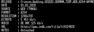 | FiLENAME: | Crimson.Wedding.S01E02.GERMAN.720P.WEB.X264-WAYNE.mkv |