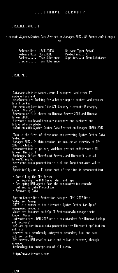| FiLENAME: | Microsoft System Center Data Protection Manager 2007 x86 Agents Multilanguage-Substance.rar |
