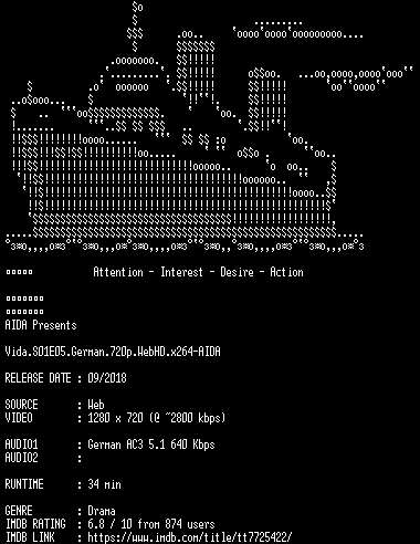 | FiLENAME: | Vida.S01E05.German.720p.WebHD.x264-AIDA.mkv |